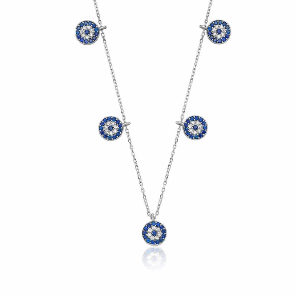 Gümüş nazar boncuğu sade tasarımıyla günlük hayatta rahatlıkla kullanabileceğiniz bir model. Nazar boncuğu sizi kem gözlerden alıkoyar. Bu şık gümüş kolye modeli üzerinde bulunan taşlar zirkondur. Gümüşün üzerine oksitlenmesi geciksin ve parlaklığını uzun süre muhafaza etsin diye rodyum kaplama yapılmıştır. Tamamen gümüş olan zincir uzunluğu ortalama 45 cm’dir. Bu nazarlı şans kolye modeli el emeği ile üretilmiştir. Gümüş ve değerli taşlar nedeniyle belirtilen ortalama ürün ağırlığında ± %10 sapma olabilmektedir.