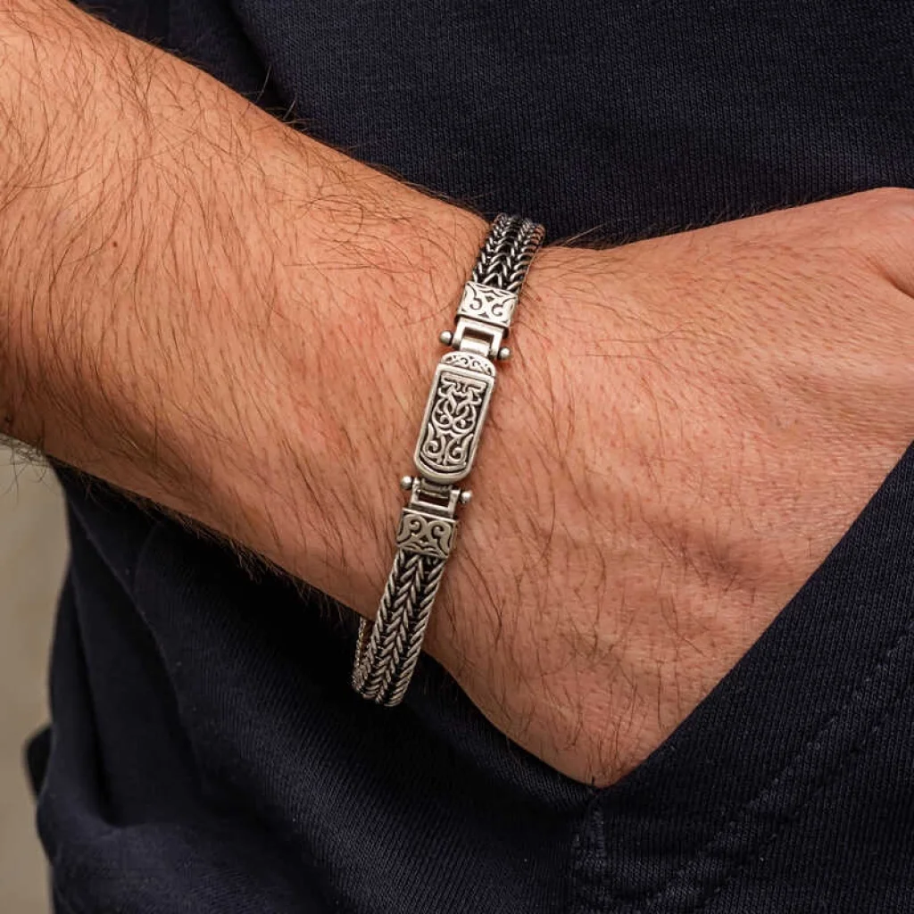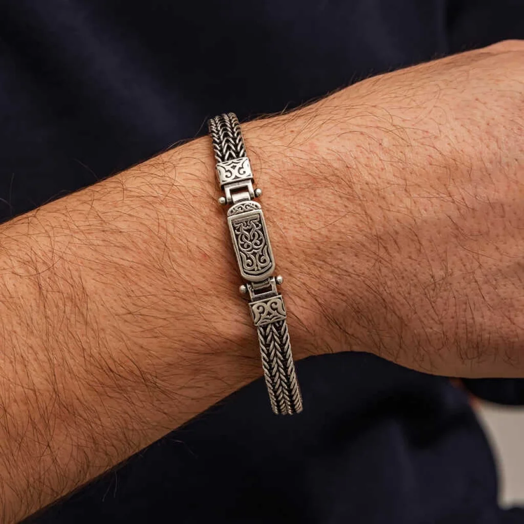 Gümüş, klasik ve zamansız bir metaldir. Bu özelliği ile oksitli desenli erkek bileklik, hem günlük hem de özel günlerde tercih edilen bir aksesuar haline gelir.Oksitli işlem, bilekliği benzersiz kılar. Her aksesuarın farklı bir dokusu ve deseni olduğu için, kullanıcı kendi stilini ifade etme imkanı bulur.Gümüş erkek bileklik; doğum günü hediyesi, sevgililer günü hediyesi veya babalara hediye olarak özel günlerde tercih edilebilecek mükemmel bir seçenektir.Gümüş üzerine oksit kaplama yapılmıştır. Oksit kaplama yapılan gümüş bileklikler parlaklığını uzun süre muhafaza eder. Tüm gümüş bilekliklerde olduğu gibi gümüş desenli erkek bileklik de el emeği ile üretilmiştir. Gümüş ve değerli taşlar nedeniyle belirtilen ortalama ürün ağırlığında ± %10 sapma olabilmektedir.