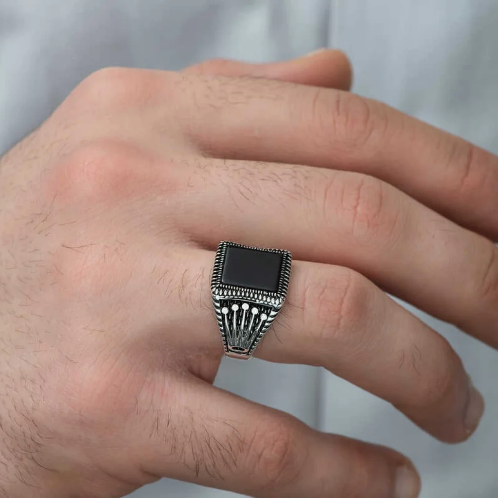 Gümüş Oniks Taşlı Taç Desenli Erkek Yüzük