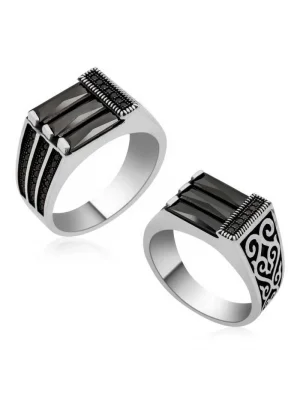 Milyonlarca yıl içerisinde yeryüzüne ulaşan oniks taşı, kayaçların ve bazı bileşenlerin ısınma ve soğumasıyla zaman içerisinde bir araya gelmesi üzerinden oluşmuş bir taştır. Oniks taşı şans taşı olarak bilinmekte olup yarı değerli bir taş türüdür. Oniks, işlenebilir olması ve estetik olarak şık durması sebebiyle eski çağlardan günümüze dek çeşitli süs eşyaları ve takıların yapımında kullanılmıştır. Oniks taşı toprak grubu burçları olan Boğa, Başak ve Oğlak’ın kutsal taşıdır. Bu burca sahip kişiler oniks taşlı aksesuarları tercih ederek negatif enerjiden korunabilirler. Yüzüğün yanlarında bulunan parmak şeklindeki taç işareti, ustanın hünerli parmaklarını sembolize etmektedir. Bir diğer yandan kral tacı görüntüsü ile de güç, iktidar ya da soyluluk simgesi olarak nitelendirilmektedir. Bu şık yüzüğü; kendinize ya da sevdiklerinize doğum gününde, babalar gününde ve diğer özel günlerde hediye edebilirsiniz. Bu şık yüzük 925 ayar gümüşten imal edilmiştir. Gümüş üzerine oksit kaplama yapılmıştır. Oksit kaplama yapılan yüzükler otantik bir görünüme kavuşur. Tüm erkek yüzüklerde olduğu gibi gümüş oniks taşlı örgü desenli erkek yüzük modeli de el emeği ile üretilmiştir. Gümüş ve değerli taşlar nedeniyle belirtilen ortalama ürün ağırlığında ± %10 sapma olabilmektedir.