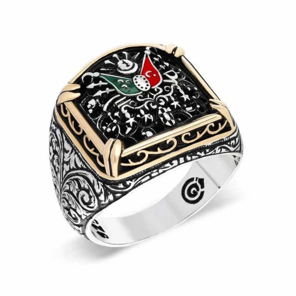 Osmanlı Devlet Arması, 19. yüzyılda Avrupa Birleşik Krallık devlet geleneğindeki nişanlardan esinlenilerek Osmanlı Devleti için hazırlanmıştır. Ondan önce, padişahların tuğraları devlet nişanı yerine geçiyordu. Osmanlı nişanının son hali 1882 yılında Sultan II. Abdülhamit tarafından yürürlüğe konmuştur. Osmanlı Devlet Nişanı"nın içinde iki adet bayrak vardır. Kırmızı zeminde ay-yıldız bulunan bayrak Osmanlıyı, yeşil zemindeki bayrak İslam halifeliğini simgelemektedir. Terazi, Osmanlı adaletini, terazide bulunan kitaplar da adaletin kaynağı olan Osmanlı kanunnamelerini ve Kur"an-ı Kerim"i temsil etmektedir. Osmanlı Devlet Arması"nda saklanan 30 gizem olduğu bilinir. Bu şık erkek yüzük modeli 925 ayar gümüşten imal edilmiştir. Gümüş üzerine eskitme bir görünüm sağlamak için oksit kaplama yapılmıştır. Tüm gümüş erkek yüzük modellerinde olduğu gibi gümüş Osmanlı Devlet Arması erkek yüzük modeli de el emeği ile üretilmiştir. Gümüş ve değerli taşlar nedeniyle belirtilen ortalama ürün ağırlığında ± %10 sapma olabilmektedir.