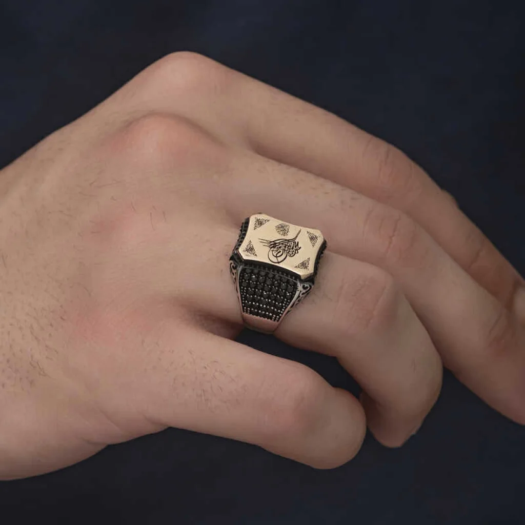 Tuğra, Osmanlı sultanlarının imzası anlamına gelir. Her tuğra; ona ait olan padişahın ismini, varlığını, hükümdarlığını ifade eder. Tuğra sembolü her padişaha göre farklı olmak üzere birçok şekilde günümüze ulaşmıştır. Tuğra; Osmanlının her döneminde korunmuş, önemini hiç kaybetmemiştir. Ve zamanla hat sanatımızda da önemli bir yere sahip olup, günümüzde hattatlar tarafından sanatsal olarak yaşatılmaktadır. Bu sanatı yansıtan gümüş yüzüğü severek kullanabilir ve sevdiklerinize hediye edebilirsiniz. Osmanlı Tuğrası Erkek Yüzük Modeli 925 ayar gümüşten imal edilmiştir. Gümüş üzerine oksit kaplama yapılmıştır. Tüm gümüş erkek yüzüklerinde olduğu gibi gümüş Osmanlı Tuğrası erkek yüzük modeli de tamamen el emeği ile üretilmiştir. Gümüş ve değerli taşlar nedeniyle belirtilen ortalama ürün ağırlığında ± %10 sapma olabilmektedir.