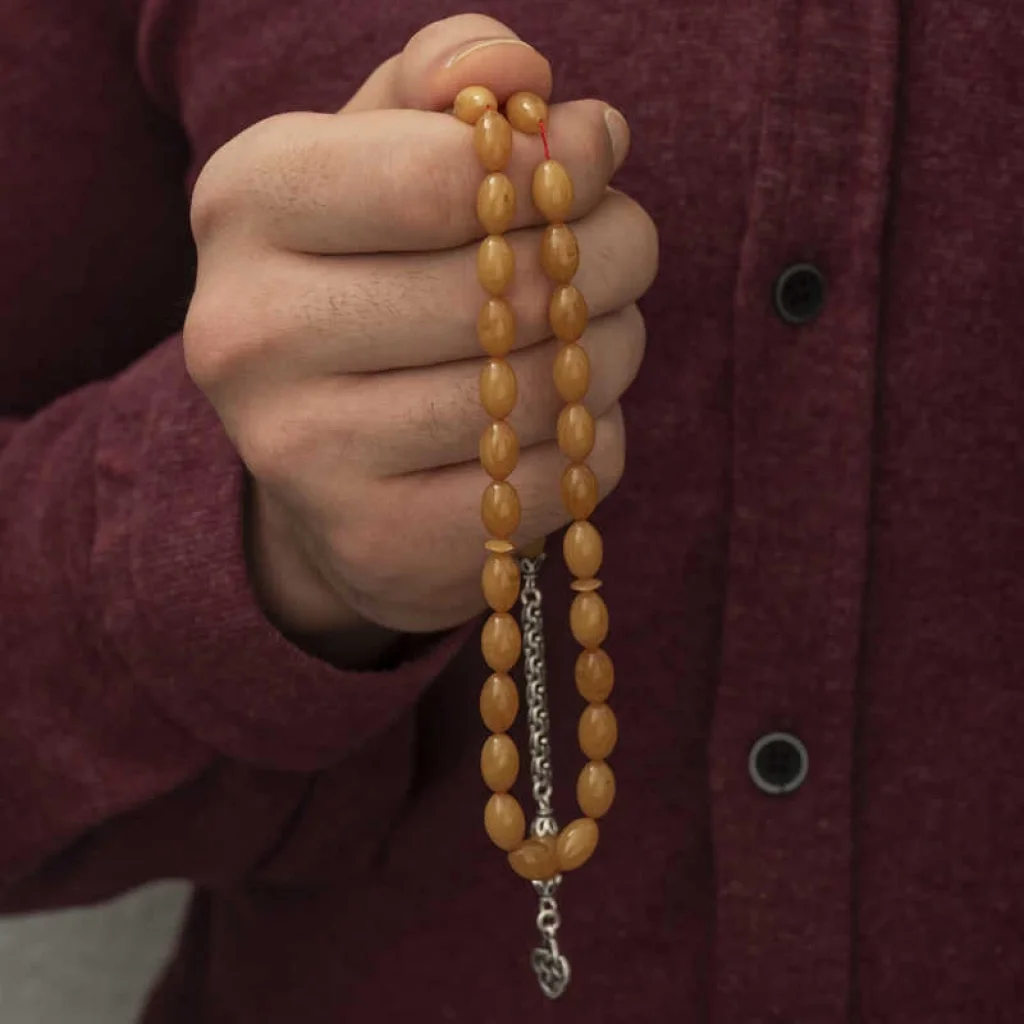 Kehribar, çam ağacı reçinesinin toprak altında uzun yıllar boyunca birikerek oluşan bir maddedir. Hemen hemen taş ile aynı sertliktedir fakat yoğunluğu düşüktür. Çam kokusu yayar. Oluşumu uzun zaman aldığından ve yapay olarak yapılamadığından değerli bir maddedir. Sıkma kehribar ise kehribar taşından farklı olarak onun özelliklerini taşıyan, görüntü itibariyle ona benzeyen fakat gerçek olmayan bir malzemedir. Ülkemizde ve dünyanın bir çok yerinde kehribar taşından çeşitli malzemeler üretilmiştir. Ülkemizde en yaygın olarak tesbih üretilmektedir. Kehribar tesbihler elde ısındıkça kehribar benzeri bir koku verir ve renk değiştirir. Bir çok rengi vardır. Hatta iki rengin birleşiminden oluşan kehribar tesbih modelleri de vardır. Genellikle gümüş püskül ile kullanılır veya sistemli olarak da kullanılabilir. Ülkemizin güzide tesbih ustaları bu malzemeyi sıklıkla işlemek suretiyle çeşitli sanat eserleri meydana getirirler. Bu tesbihler de koleksiyonerler tarafından alınıp satılmaktadır. Gümüş püsküllü arpa sıkma kehribar tesbih modeli de günlük hayatta kullanılabilecek çok şık bir tesbih çeşididir. Özel günlerin vazgeçilmez hediyesi sıkma kehribar tesbihler erkekler için doğum günü, sevgililer günü ve babalar günü gibi özel zamanlarda hediye olarak tercih edilebilir. Gümüş püsküllü arpa sıkma kehribar tesbih modeli diğer kehribar tesbih modellerinde olduğu gibi tamamen el emeği ile imal edilmiştir.