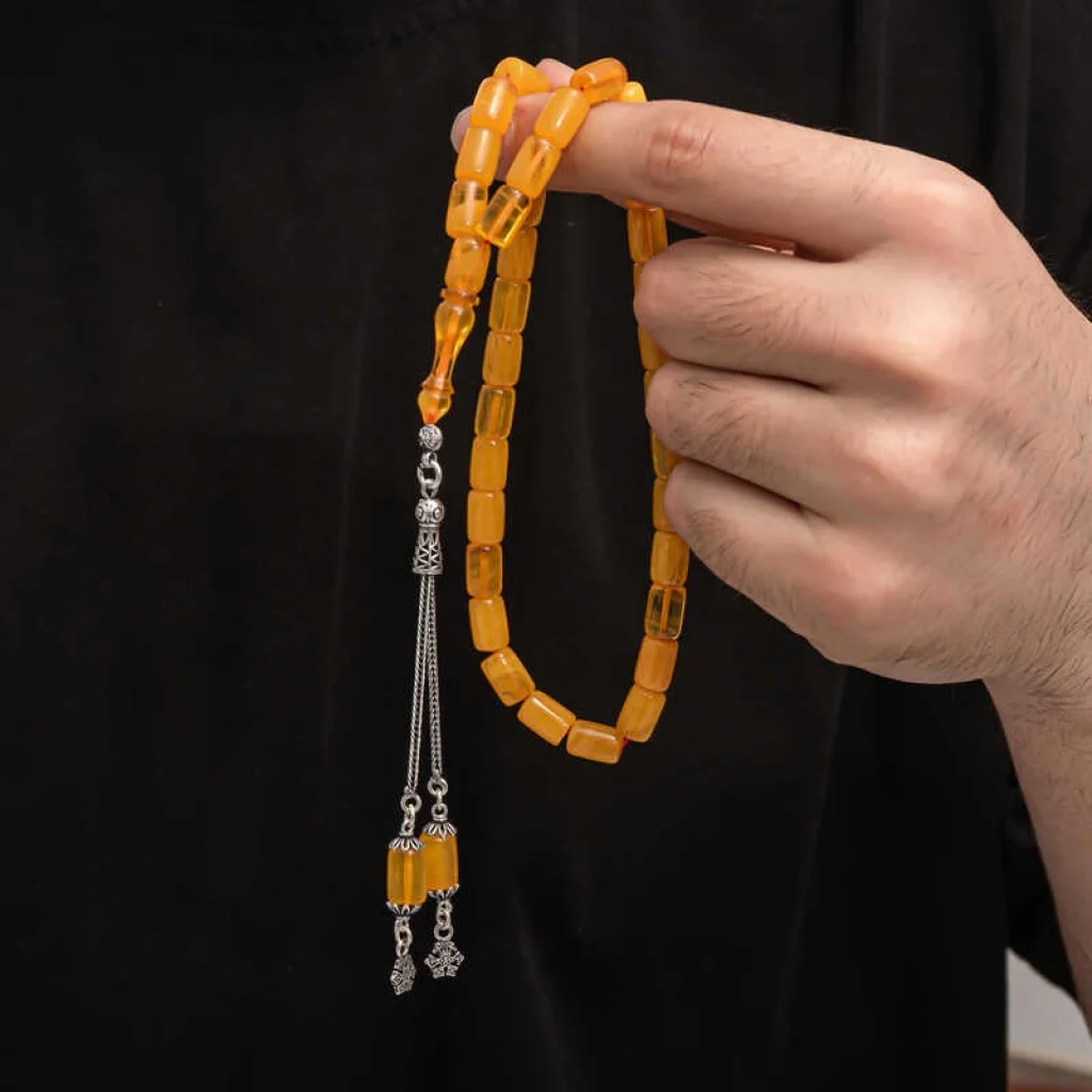 Kehribar, çam ağacı reçinesinin toprak altında uzun yıllar boyunca birikerek oluşan bir maddedir. Hemen hemen taş ile aynı sertliktedir fakat yoğunluğu düşüktür. Çam kokusu yayar. Oluşumu uzun zaman aldığından ve yapay olarak yapılamadığından değerli bir maddedir. Sıkma kehribar ise kehribar taşından farklı olarak onun özelliklerini taşıyan, görüntü itibariyle ona benzeyen fakat gerçek olmayan bir malzemedir. Ülkemizde ve dünyanın bir çok yerinde kehribar taşından çeşitli malzemeler üretilmiştir. Ülkemizde en yaygın olarak tesbih üretilmektedir. Kehribar tesbihler elde ısındıkça kehribar benzeri bir koku verir ve renk değiştirir. Bir çok rengi vardır. Hatta iki rengin birleşiminden oluşan kehribar tesbih modelleri de vardır. Genellikle gümüş püskül ile kullanılır veya sistemli olarak da kullanılabilir. Ülkemizin güzide tesbih ustaları bu malzemeyi sıklıkla işlemek suretiyle çeşitli sanat eserleri meydana getirirler. Bu tesbihler de koleksiyonerler tarafından alınıp satılmaktadır. Gümüş püsküllü sıkma kehribar tesbih modeli de günlük hayatta kullanılabilecek çok şık bir tesbih çeşididir. Özel günlerin vazgeçilmez hediyesi sıkma kehribar tesbihler erkekler için doğum günü, sevgililer günü ve babalar günü gibi özel zamanlarda hediye olarak tercih edilebilir. Gümüş püsküllü sıkma kehribar tesbih modeli diğer kehribar tesbih modellerinde olduğu gibi tamamen el emeği ile imal edilmiştir.