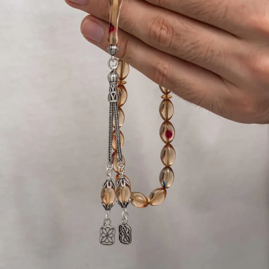 Kehribar, çam ağacı reçinesinin toprak altında uzun yıllar boyunca birikerek oluşan bir maddedir. Hemen hemen taş ile aynı sertliktedir fakat yoğunluğu düşüktür. Çam kokusu yayar. Oluşumu uzun zaman aldığından ve yapay olarak yapılamadığından değerli bir maddedir. Sıkma kehribar ise kehribar taşından farklı olarak onun özelliklerini taşıyan, görüntü itibariyle ona benzeyen fakat gerçek olmayan bir malzemedir. Ülkemizde ve dünyanın bir çok yerinde kehribar taşından çeşitli malzemeler üretilmiştir. Ülkemizde en yaygın olarak tesbih üretilmektedir. Kehribar tesbihler elde ısındıkça kehribar benzeri bir koku verir ve renk değiştirir. Bir çok rengi vardır. Hatta iki rengin birleşiminden oluşan kehribar tesbih modelleri de vardır. Genellikle gümüş püskül ile kullanılır veya sistemli olarak da kullanılabilir. Ülkemizin güzide tesbih ustaları bu malzemeyi sıklıkla işlemek suretiyle çeşitli sanat eserleri meydana getirirler. Bu tesbihler de koleksiyonerler tarafından alınıp satılmaktadır. Gümüş püsküllü sıkma kehribar tesbih modeli de günlük hayatta kullanılabilecek çok şık bir tesbih çeşididir. Özel günlerin vazgeçilmez hediyesi sıkma kehribar tesbihler erkekler için doğum günü, sevgililer günü ve babalar günü gibi özel zamanlarda hediye olarak tercih edilebilir. Gümüş püsküllü sıkma kehribar tesbih modeli diğer kehribar tesbih modellerinde olduğu gibi tamamen el emeği ile imal edilmiştir.