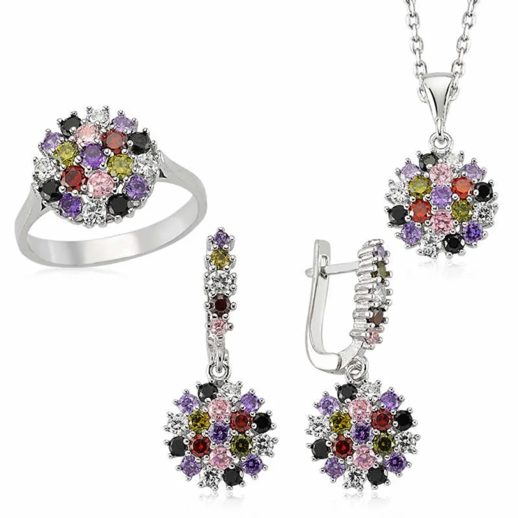 Gümüş ve renkli zirkon taşların ışıltısı dünyanıza renk katacak. Zirkonun göz alıcı parıltısı, geometrik şekli ve renkleri ile doğanın ritmine ayak uyduruyor. Severek kullanacağınız, yaşam enerjinizi artıracak bu set modeli 925 ayar gümüşten imal edilmiştir. Gümüş üzerine rodyum kaplama yapılmıştır. Rodyum kaplama yapılan gümüş setler parlaklığını uzun süre muhafaza eder, oksitlenmesi gecikir. Üzerinde bulunan taşlar zirkondur. Zincir boyu ortalama 45 cm"dir. Ürünlerimizin tamamı el emeği ile üretilmiştir. Gümüş ve değerli taşlar nedeniyle belirtilen ortalama ürün ağırlığında ± %10 sapma olabilmektedir.