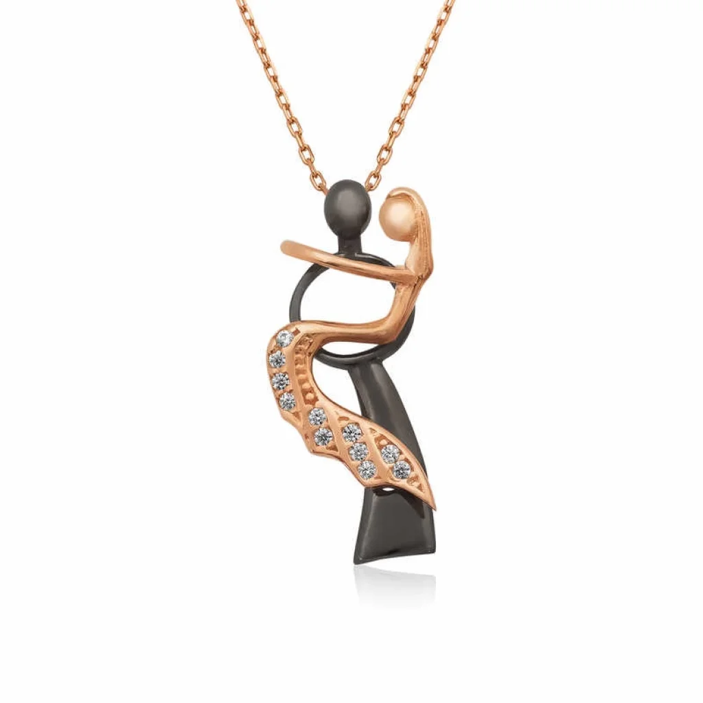 Dans eden iki aşıktan oluşan gümüş kolye günlük hayatta severek kullanabileceğiniz ve sevdiklerinize özel günlerde hediye edebileceğiniz hoş bir aksesuardır. Sevgililer günü, yıl dönümü veya sevgilinizin doğum gününde iyi bir hediye arıyorsanız bu şık kolye tam size göre... Aksesuar olarak son derece şık bir tasarıma sahip olan bu kolye dilerseniz günlük hayatta dilerseniz, davetlerde kullanabileceğiniz her kıyafetinize uyacak oldukça başarılı bir tasarımdır. Sevdiklerine eşsiz bir hediye vermek isteyen kişiler için kaçırılmayacak bir fırsattır. Dans eden çift bayan kolye modeli 925 ayar gümüşten imal edilmiştir. Gümüş üzerine rose altın kaplama yapılmıştır. Rose altın kaplama yapılan gümüş bayan kolye modelleri parlaklığını uzun süre muhafaza eder ve oksitlenmesi gecikir. Kolye üzerinde bulunan taşlar zirkondur. Gümüş kolyenin ortalama boyu 45 cm"dir. Tüm bayan kolye modellerinde olduğu gibi gümüş anahtar bayan kolye modeli de el emeği ile üretilmiştir. Gümüş ve değerli taşlar nedeniyle belirtilen ürün ağırlığında ± %10 sapma olabilmektedir.