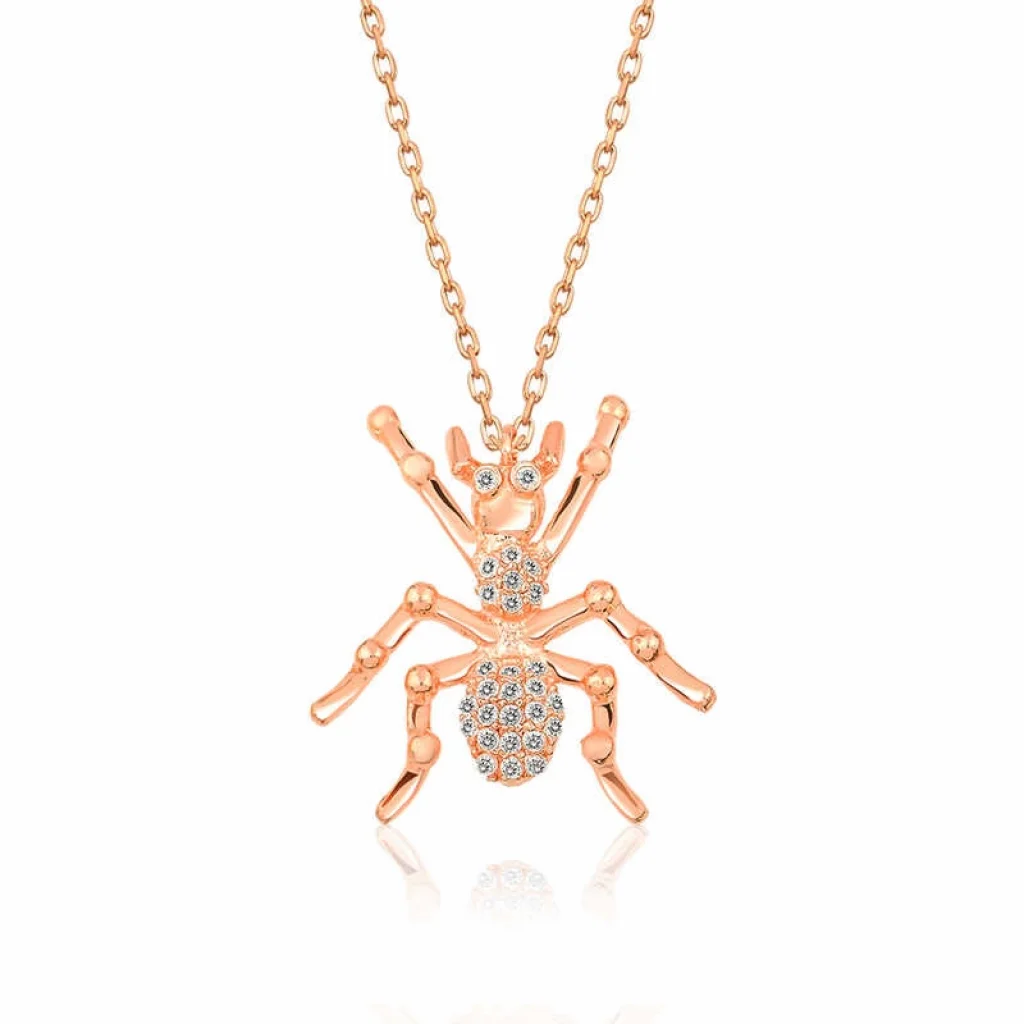 Örümcek; mitolojide, sembolizmde ve efsanelerde yer alan popüler kültürün çeşitli filmlerinde yer almışlardır. Müslümanlar için örümceğin önemi, Peygamberi (S.A.V) ve ilk Müslümanlardan Ebubekir’i (R.A.)Sevr Dağı’ndaki mağarada saklanırken koruyan ve düşmanının gözünden saklayan büyük ağı örmesinde yatar. Mağara önünde birden yetişen ağaca çabucak yuva kuran güvercinler de, bu öneme layık varlıklardandır. Gümüş örümcek bayan kolye modeli 925 ayar gümüşten imal edilmiştir. Gümüş üzerine rose kaplama yapılmıştır. Rose kaplama yapılan gümüş bayan kolyeler parlaklığını uzun süre muhafaza eder ve oksitlenmesi gecikir. Gümüş olan zincirin boyu ortalama 45 cm'dir. Tüm gümüş bayan kolye modellerinde olduğu gibi gümüş örümcek bayan kolye modeli de el emeği ile üretilmiştir. Gümüş ve değerli taşlar nedeniyle belirtilen ortalama ürün ağırlığında ± %10 sapma olabilmektedir.