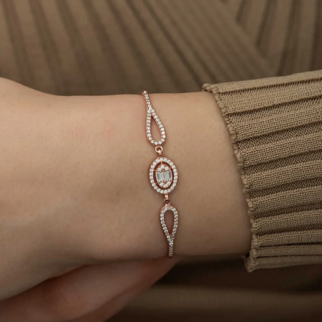 Modaya uyumlu şekilde tasarlanan gümüş baget bileklik modellerini hem gündelik yaşantınızda hem özel gün ve gecelerinizde şık bir şekilde kullanabilirsiniz. Yenilikçi her yaştan kadının beğenisine hitap eden ürünlerle kombinlerinizi tamamlayabilirsiniz. Her biri farklı bir stile hitap edebilen tasarımlarla sizler de spor, klasik ve alternatif giyim tarzlarınıza uygun modellerimizi tercih edebilirsiniz. Bu şık bileklik; doğum günü hediyesi, sevgililer günü hediyesi veya özel günlerde tercih edilebilecek mükemmel bir seçenektir. Gümüş rose oval baget taşlı bayan bileklik 925 ayar gümüşten imal edilmiştir. Bu bileklik üzerinde rose altın kaplama vardır. Rose altın kaplama yapılan ürünler parlaklığını uzun süre muhafaza eder, oksitlenmesini geciktirir. Tüm gümüş bayan bileklik modellerinde olduğu gibi gümüş rose oval baget taşlı bayan bileklik modeli de el emeği ile üretilmiştir. Gümüş ve değerli taşlar nedeniyle belirtilen ortalama ürün ağırlığında ± %10 sapma olabilmektedir.