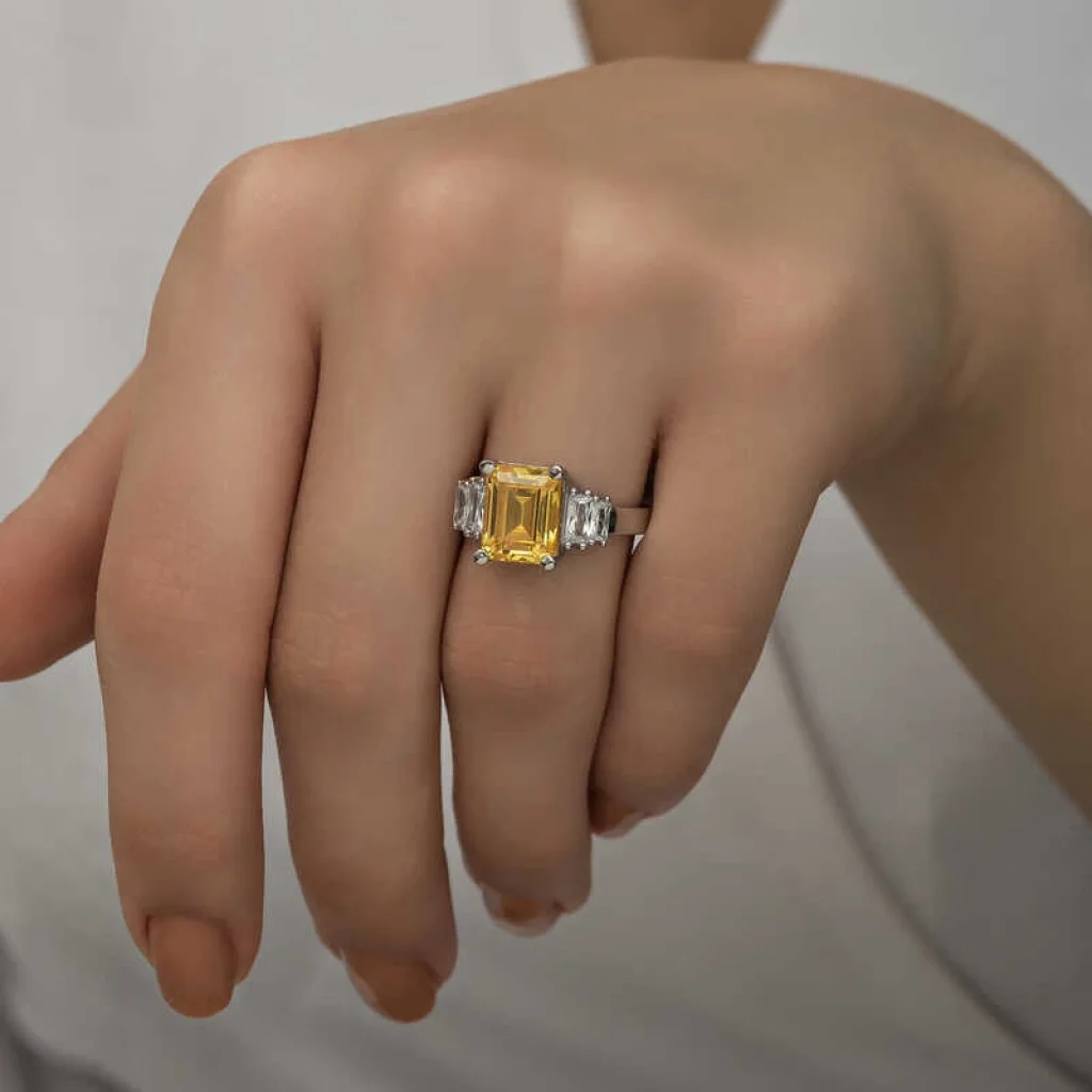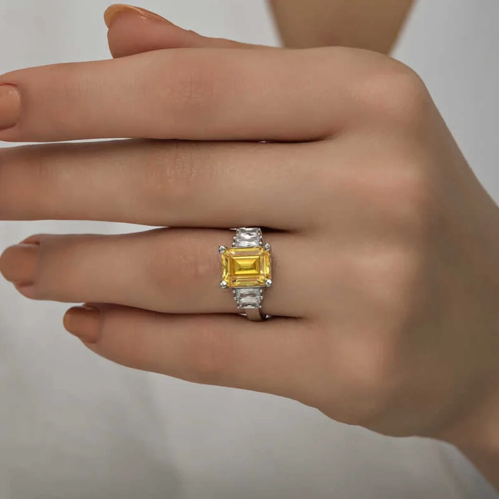 Işıl ışıl baget taşlarla süslenmiş bu şık yüzük modeli; doğum günü hediyesi, sevgililer günü hediyesi veya annelere hediye olarak özel günlerde tercih edebileceğiniz çok şık bir seçenektir.Yüzük 925 ayar gümüşten imal edilmiştir. Gümüş üzerine rodyum kaplama yapılmıştır. Rodyum kaplama yapılan gümüş yüzükler parlaklığını uzun süre muhafaza eder, oksitlenmesi gecikir. Üzerinde bulunan taşlar bagettir. Tüm bayan gümüş yüzüklerde olduğu gibi gümüş sarı baget taşlı bayan yüzük modeli de el emeği ile üretilmiştir. Gümüş ve değerli taşlar nedeniyle belirtilen ortalama ürün ağırlığında ± %10 sapma olabilmektedir.