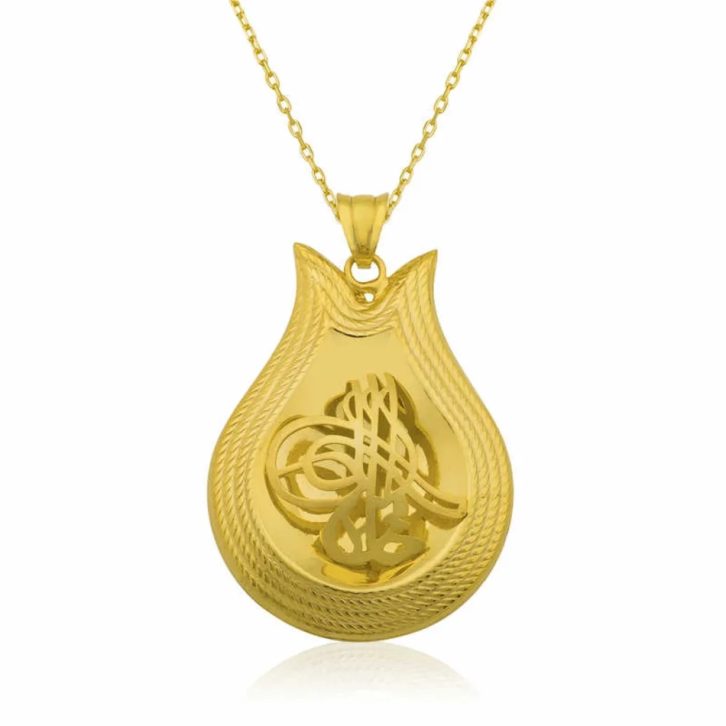 Tuğra, Osmanlı sultanlarının imzası anlamına gelir. Her tuğra; ona ait olan padişahın ismini, varlığını, hükümdarlığını ifade eder. Tuğra sembolü her padişaha göre farklı olmak üzere birçok şekilde günümüze ulaşmıştır. Tuğra Osmanlının her döneminde korunmuş, önemini hiç kaybetmemiştir. Ve zamanla hat sanatımızda da önemli bir yere sahip olup, günümüzde hattatlar tarafından sanatsal olarak yaşatılmaktadır. Bu mükemmel kolyeyi; doğum günü hediyesi, sevgililer günü hediyesi veya annelere hediye olarak özel günlerde tercih edebilirsiniz. Sarı tuğra bayan kolye 925 ayar gümüşten imal edilmiştir. Gümüş üzerine altın kaplama yapılmıştır. Altın kaplama yapılan kolyeler parlaklığını uzun süre muhafaza eder, gümüş rengini sarı renge dönüştürür ve oksitlenmeyi geciktirir. Üzerinde bulunan beyaz taşlar zirkondur. Tüm gümüş bayan kolyelerde olduğu gibi gümüş sarı tuğra bayan kolye de el emeği ile üretilmiştir. Gümüş ve değerli taşlar nedeniyle belirtilen ürün ağırlığında ± %10 sapma olabilmektedir.