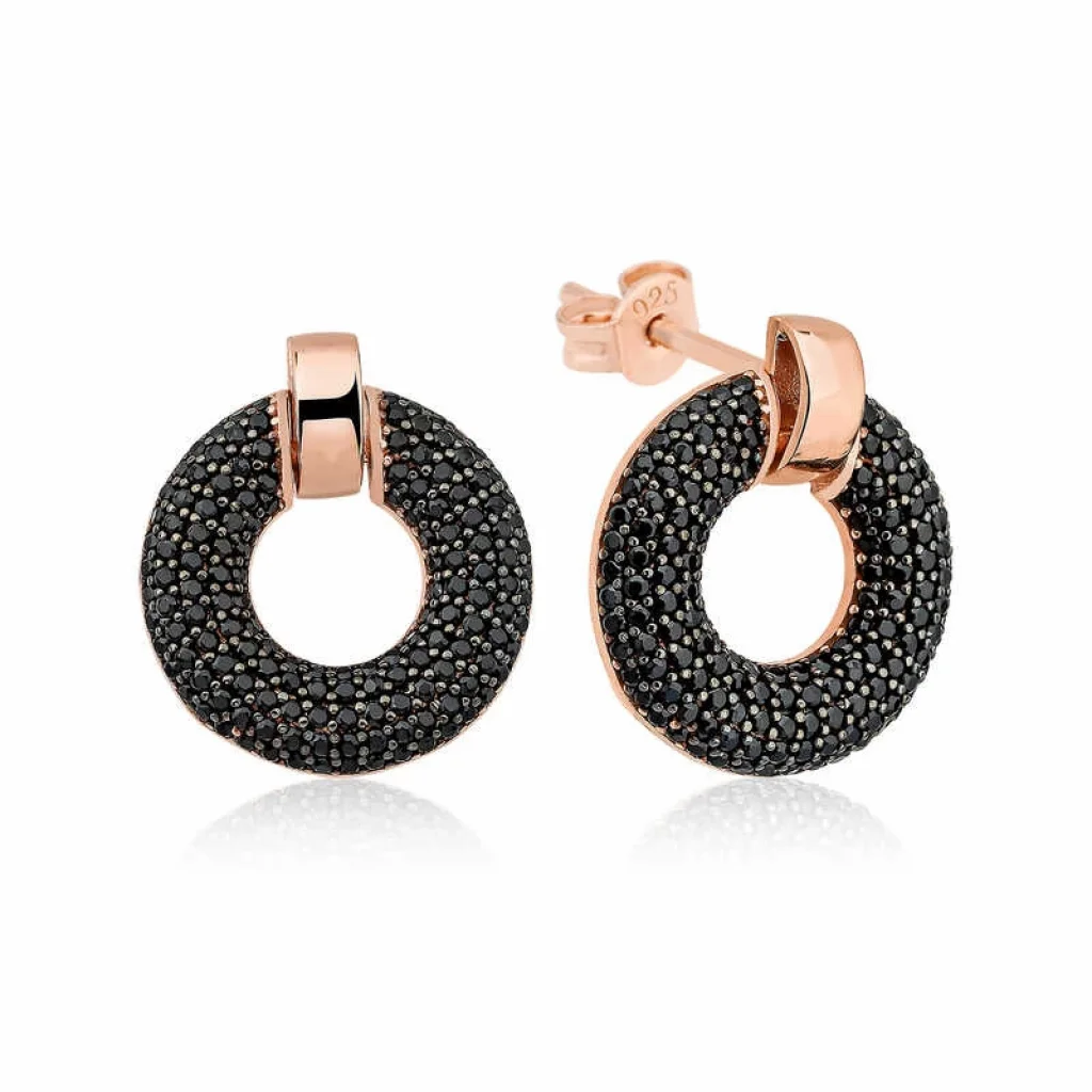 Günlük kullanımlara uygun minimalist modellerden, davetlerde kıyafetlerinizi tamamlayacak daha gösterişli tasarımlara kadar, gümüş küpeler her an sizlerle birlikte. Bu koleksiyonda hem kendiniz, hem de sevdikleriniz için mutlaka uygun bir küpe bulacaksınız. Bu şık siyah çok taşlı daire bayan küpe 925 ayar gümüşten imal edilmiştir. Gümüş üzerine rose kaplama yapılmıştır. Rose kaplama yapılan ürünler parlaklığını uzun süre muhafaza eder, gümüşü bakır rengine dönüştürür. Tüm bayan küpelerinde olduğu gibi gümüş siyah çok taşlı daire bayan küpe de el emeği ile üretilmiştir. Gümüş ve değerli taşlar nedeniyle ürün ağırlığında ± %10 sapma olabilmektedir.