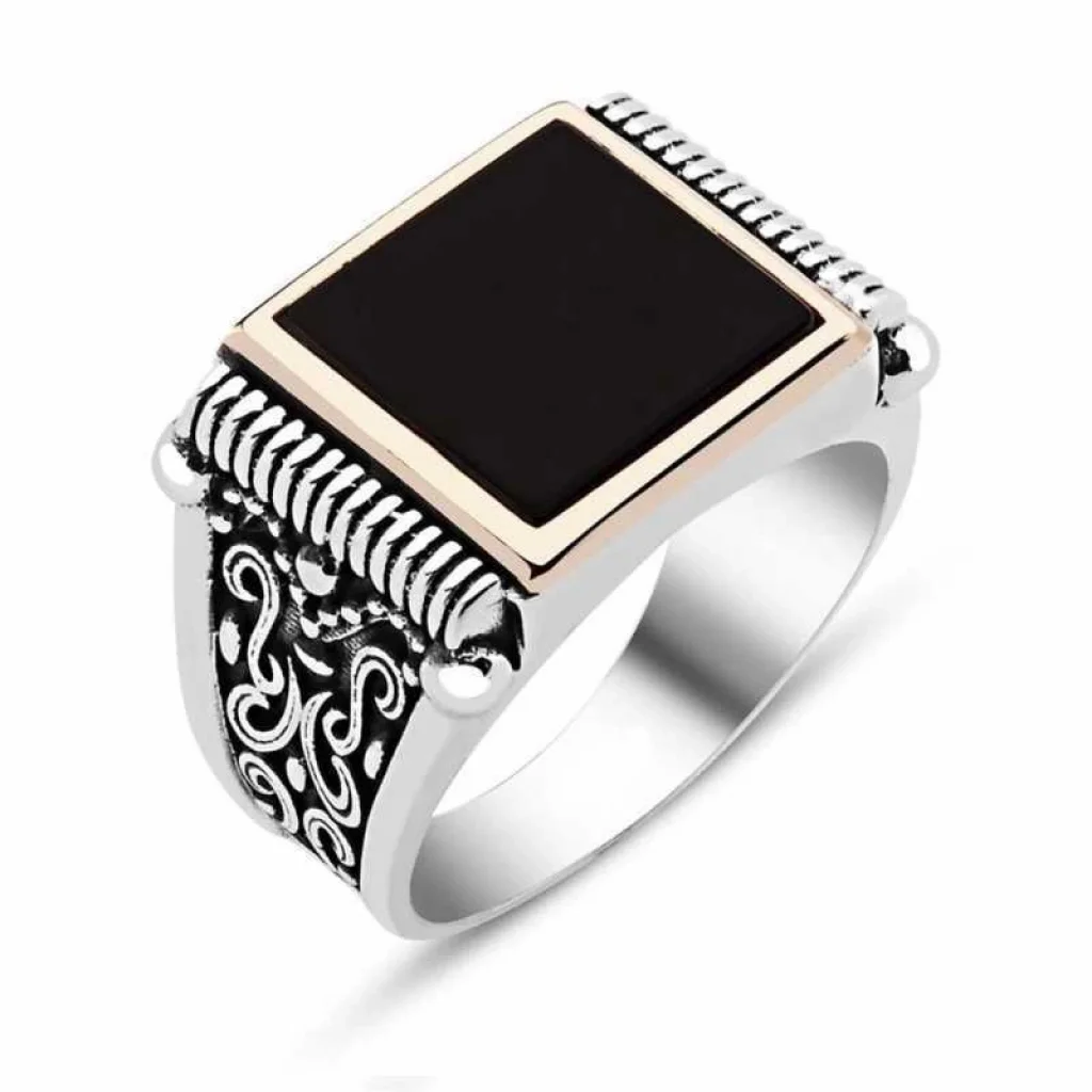 Siyah taşlı erkek yüzük modeli 925 ayar gümüş ve bronzdan imal edilmiştir. Gümüş üzerine oksit kaplama yapılmıştır. Oksit kaplama yapılan gümüş erkek yüzük modelleri otantik bir görünüme sahip olur. Yüzük üzerinde bulunan siyah taş onikstir. Tüm gümüş erkek yüzüklerinde olduğu gibi gümüş siyah taşlı erkek yüzük modeli de tamamen el emeği ile üretilmiştir. Gümüş ve değerli taşlar nedeniyle belirtilen ortalama ürün ağırlığında ± %10 sapma olabilmektedir.