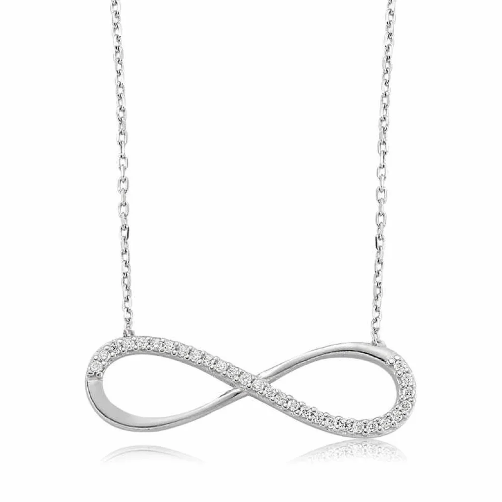 Sevgilinize sonsuz aşkı ifade etmenin en güzel, en anlamlı yollarından biri de ona sonsuzluk temalı gümüş takılar hediye etmektir. Sevgilinize hediye edeceğiniz bu özel kolye ile ona olan sonsuz aşkınızı sevginizi ifade edebilir sonsuza kadar birlikte olacağınız mesajı verebilirsiniz. Sonsuzluk bayan kolye modeli 925 ayar gümüşten imal edilmiştir. Gümüş üzerine rodyum kaplama yapılmıştır. Rodyum kaplama yapılan gümüş bayan kolye modelleri parlaklığını uzun süre muhafaza eder ve oksitlenmesi gecikir. Kolye üzerinde bulunan taşlar zirkondur. Gümüş olan zincirin boyu ortalama 45 cm"dir. Tüm gümüş bayan kolye modellerinde olduğu gibi gümüş sonsuzluk bayan kolye modeli de el emeği ile üretilmiştir. Gümüş ve değerli taşlar nedeniyle belirtilen ürün ağırlığında ± %10 sapma olabilmektedir.