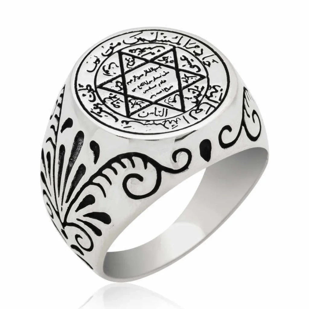 Bu mührün bulunduğu yüzük, Adem a.s.’ın kullandığı ve dünyaya gelirken cennette bıraktığı, daha sonra Cebrail a.s tarafından Cenab-Hakkın izniyle Davud a.s.’a getirilmiştir. Oğlu Süleyman a.s layık olduğundan ona verilmiştir. Öncelikle yüce ALLAH’ın CELAL ve CEMAL sıfatlarını sembolize eder. Bu mühür remizdir, rahmani bir semboldür. Sizde Gümüş Süleyman Mührü Yüzüğü sevdiklerinize armağan edebilirsiniz. Yüzük 925 ayar gümüşten imal edilmiştir. Gümüşe oksit kaplama yapılmıştır. Ürünlerimizin tamamı el emeği ile üretilmiştir. Gümüş ve değerli taşlar nedeniyle belirtilen ortalama ürün ağırlığında ± %10 sapma olabilmektedir.