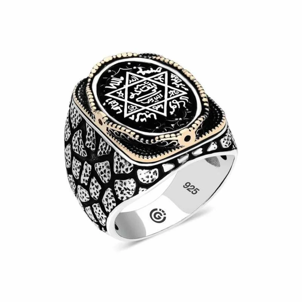 Gümüş üzerindeki süleyman mührü oval erkek yüzük modeli günün her anında kullanabileceğiniz şık bir aksesuardır. Bu yüzüğü; kendinize ya da sevdiklerinize doğum gününde, babalar gününde ya da özel günlerde hediye edebilirsiniz. Süleymam mührü oval erkek yüzük modeli 925 ayar gümüşten imal edilmiştir. Gümüş üzerine oksit kaplama yapılmıştır. Oksit kaplama yapılan gümüş erkek yüzük modelleri parlaklığını uzun süre muhafaza eder. Tüm erkek yüzüklerde olduğu gibi gümüş süleyman mührü oval erkek yüzük modeli de el emeği ile üretilmiştir. Gümüş ve değerli taşlar nedeniyle belirtilen ortalama ürün ağırlığında ± %10 sapma olabilmektedir.​