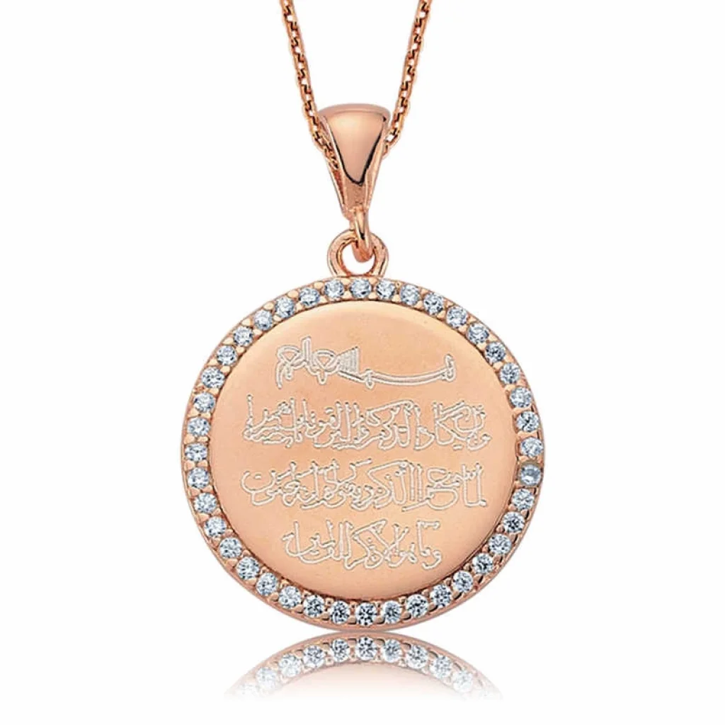 Nazar bakış demektir ve her canlıya nazar değebilmektedir. Bu nazar hastalığından korunmak, şifa bulmak için nazar duası okunur... Bu maneviyatı yüksek kolye; doğum günü hediyesi, sevgililer günü hediyesi veya annelere hediye olarak özel günlerde tercih edilebilecek mükemmel bir seçenektir. Kolye; 925 ayar gümüşten imal edilmiştir. Kolye üzerine rose altın kaplama yapılmıştır. Rose altın kaplama yapılan ürünler parlaklığını uzun süre muhafaza eder, gümüşü pembe renge dönüştürür ve oksitlenmeyi geciktirir. Kolye üzerinde bulunan taşlar zirkondur. Tüm gümüş bayan kolyelerde olduğu gibi gümüş taşlı nazar duası bayan kolye de el emeği ile üretilmiştir. Gümüş ve değerli taşlar nedeniyle belirtilen ortalama ürün ağırlığında ± %10 sapma olabilmektedir.