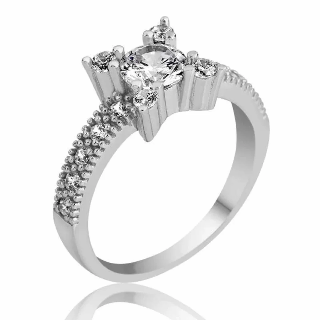 Klasik tek taş modellerinin güzel bir örneği olan bu model tüm bayan yüzük modelleri arasında dikkat çekici tasarımıyla ön plana çıkıyor. 925 ayar gümüşten imal edilmiş olup, yüzük üzerine rodyum kaplama yapılmıştır. Rodyum kaplama yapılan gümüş yüzük modelleri parlaklığını uzun süre muhafaza eder, oksitlenmesi gecikir. Yüzük üzerinde kullanılan beyaz taş zirkondur. Zirkon pırlanta benzeri bir taştır. Görüntü itibariyle pırlantaya benzer ama gerçek değildir. Genelde gümüş bayan tek taş yüzük modellerinde zirkon taş kullanılır. Bayan tek taş yüzük modellerinin tamamı el emeği ile üretilmiştir. Gümüş ve değerli taşlar nedeniyle belirtilen ortalama ürün ağırlığında ± %10 sapma olabilmektedir.