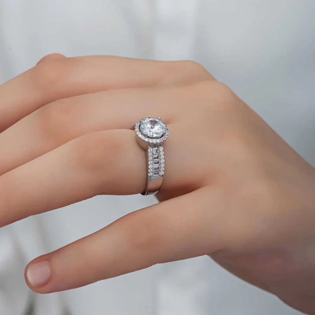 Bu özel tasarım tek taş yüzük 925 ayar gümüşten imal edilmiştir. Gümüş üzerine rodyum kaplama yapılmıştır. Rodyum kaplama yapılan kadın gümüş yüzük modelleri parlaklığını uzun süre muhafaza eder, oksitlenmesi gecikir. Yüzük üzerinde bulunan taşlar zirkon ve bagettir. Sevdiğinize doğum günü, sevgililer günü ve özel günlerde verebileceğiniz mükemmel bir hediye seçeneğidir. Gümüş kadın yüzük modellerimizin tamamında olduğu gibi bu tek taş kadın yüzük de tamamen el emeği ile üretilmiştir. Gümüş ve değerli taşlar nedeniyle belirtilen ortalama ürün ağırlığında ± %10 sapma olabilmektedir.