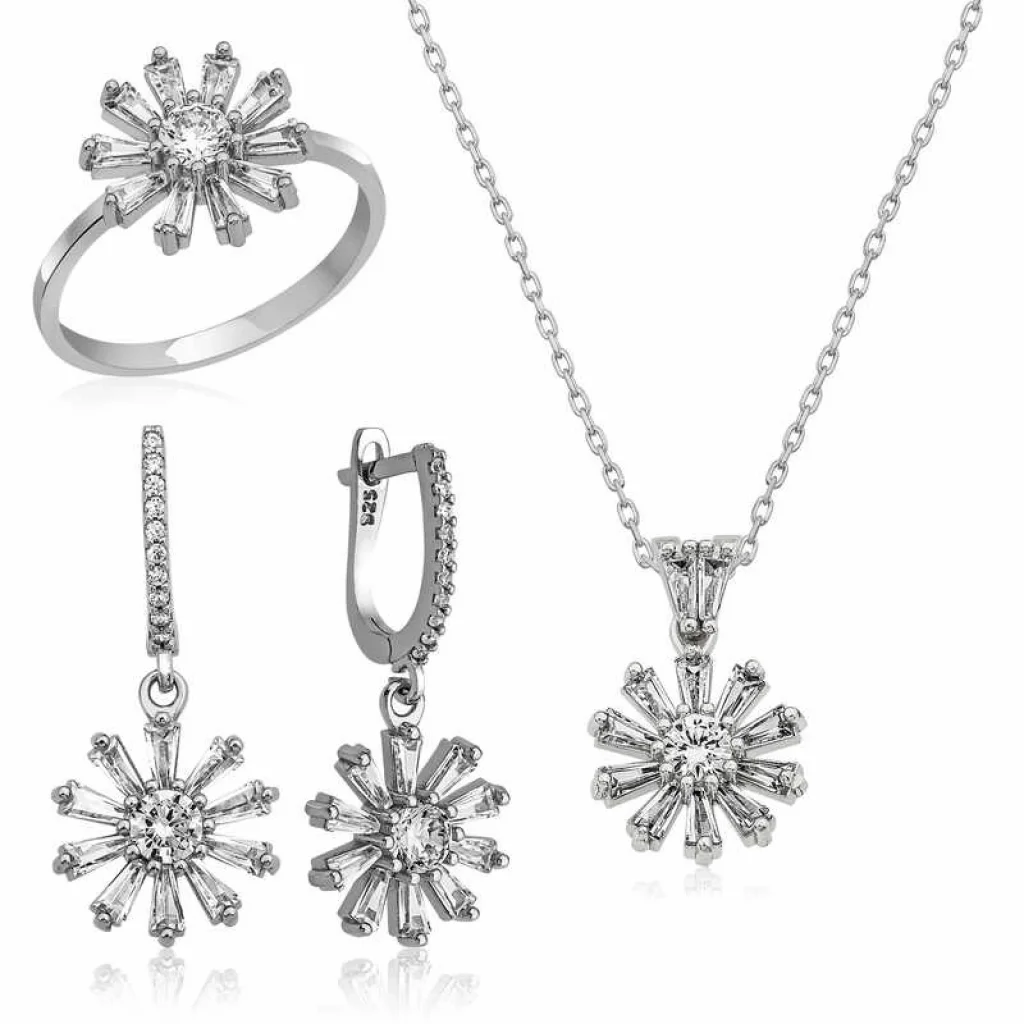 Gümüş Trapez Taşlı Çiçek Bayan Set