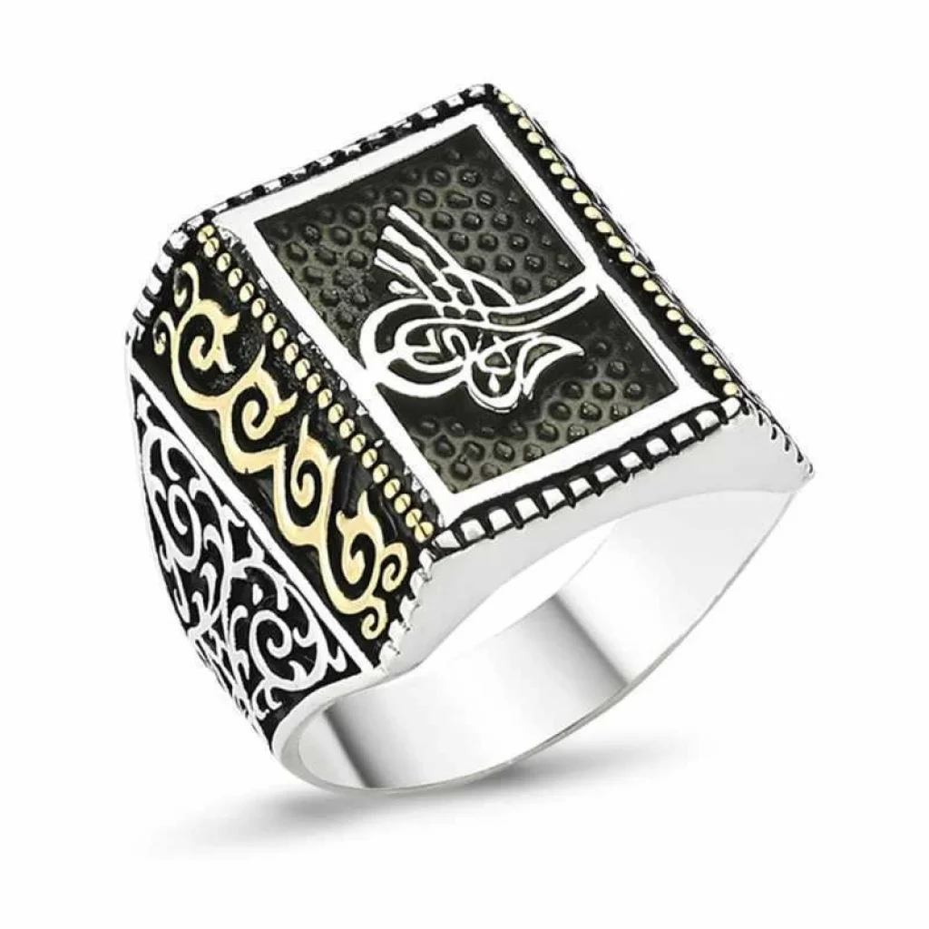 Tuğra, Osmanlı sultanlarının imzası anlamına gelir. Her tuğra; ona ait olan padişahın ismini, varlığını, hükümdarlığını ifade eder. Tuğra sembolü her padişaha göre farklı olmak üzere birçok şekilde günümüze ulaşmıştır. Tuğra Osmanlının her döneminde korunmuş, önemini hiç kaybetmemiştir. Ve zamanla hat sanatımızda da önemli bir yere sahip olup, günümüzde hattatlar tarafından sanatsal olarak yaşatılmaktadır. Bu sanatı yansıtan gümüş yüzüğü severek kullanabilir, babalar gününde yada özel günlerde sevdiklerinize hediye edebilirsiniz. Gümüş tuğralı erkek yüzük 925 ayar gümüşten imal edilmiştir. Tuğralı yüzük gümüş üzerine oksit kaplama yapılmıştır. Oksit kaplama yapılan erkek yüzük modelleri otantik bir görünüme sahip olur. Tüm gümüş erkek yüzüklerde olduğu gibi gümüş tuğralı erkek yüzüğünde tamamı el emeği ile üretilmiştir. Gümüş ve değerli taşlar nedeniyle belirtilen ortalama ürün ağırlığında ± %10 sapma olabilmektedir.