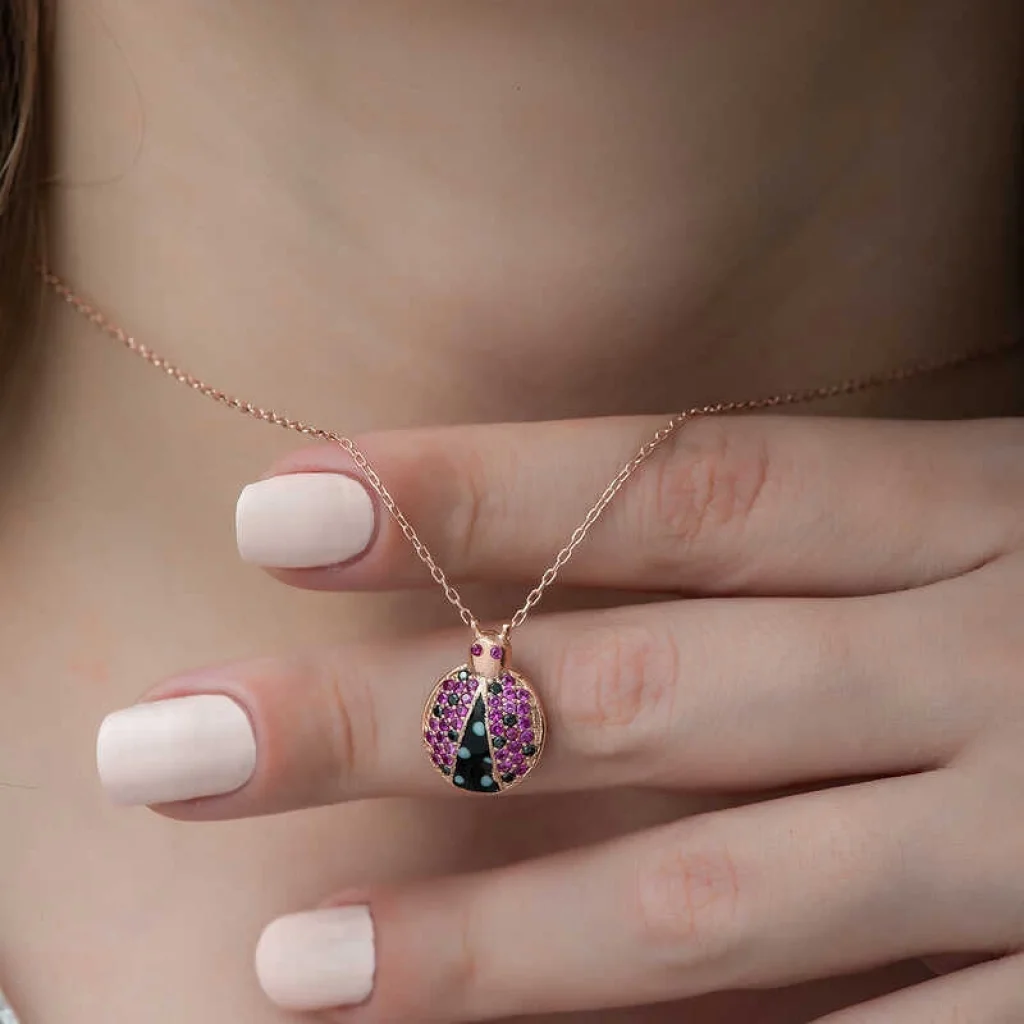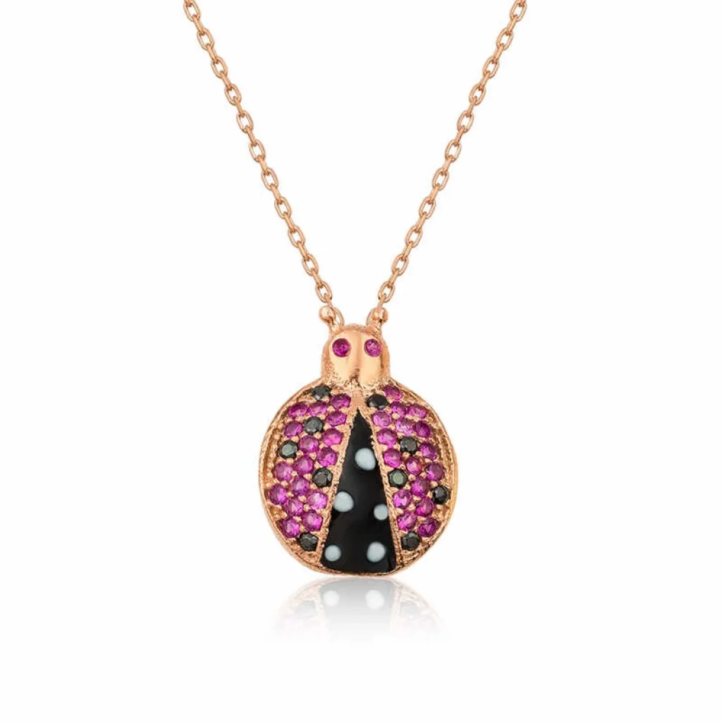 Uğur böceği, pek çok kültürde iyiliğin, şansın, talihin simgesi olarak bilinmektedir. Orta Avrupa’da eline uğur böceği konan kızın evleneceği, Kuzey Avrupa’da ki bazı ülkelerde ise üzerine uğur böceği konan kişinin dileklerinin gerçekleştireceği inancı yaygındır. Şansın simgesi olan uğur böceği kolye size ve sevdiklerinize uğur getirecek. Uğur böceği bayan kolye modeli 925 ayar gümüşten imal edilmiştir. Gümüş üzerine rose altın kaplama yapılmıştır. Rose altın kaplama yapılan gümüş uğur böceği kolye modelleri parlaklığını uzun süre muhafaza eder ve oksitlenmesi gecikir. Kolye üzerinde bulunan taşlar zirkondur. Gümüş olan zincir boyu ortalama 45 cm"dir. Gümüş uğur böceği bayan kolye modeli el emeği ile üretilmiştir. Gümüş ve değerli taşlar nedeniyle belirtilen ortalama ürün ağırlığında ± %10 sapma olabilmektedir.