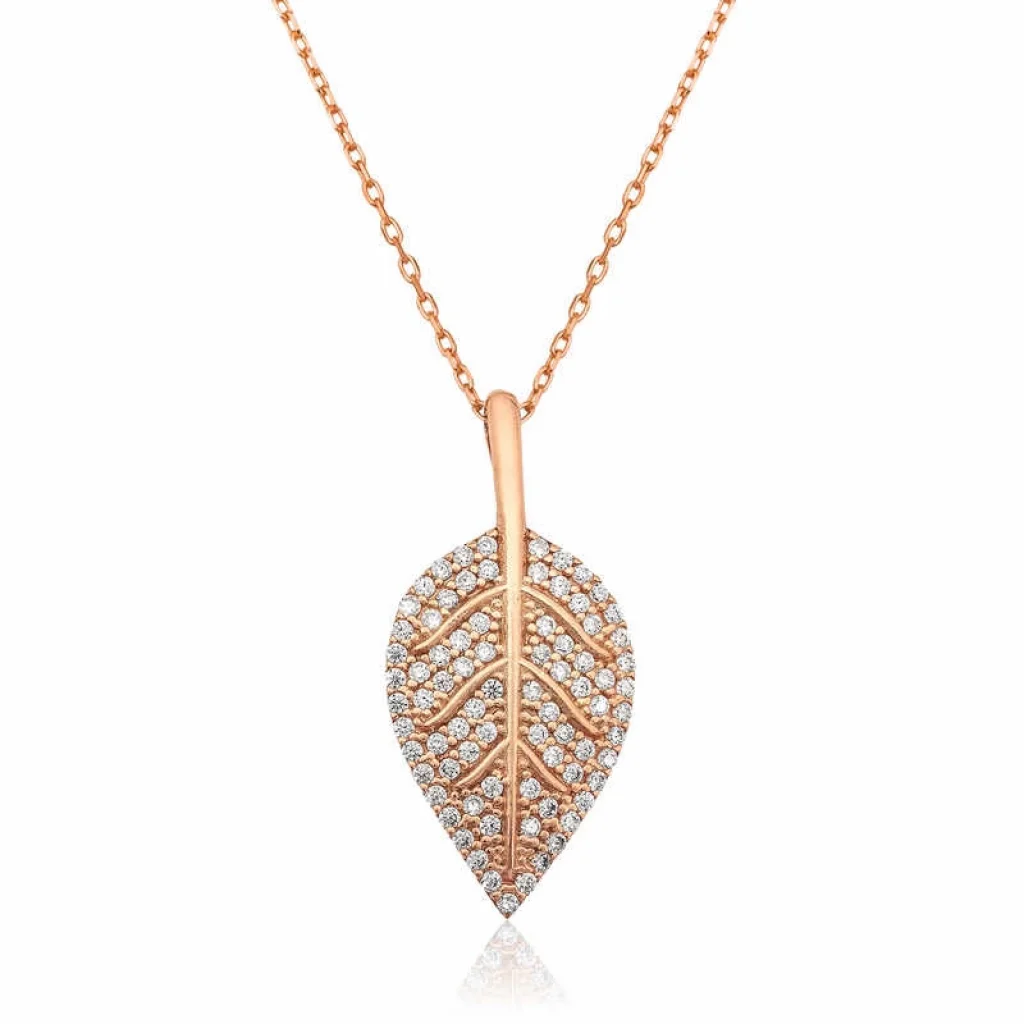 Yaprak deseni tabiattan almakta olduğu kuvveti, saygıyı ve zarafeti simgeler. ""Güçlüyüm ve yeniden doğmayı bilirim"" imajı çizmektedir ve evrene olan saygıyı belirtmektedir. Çiçekler ve bununla birlikte yapraklar, insanoğluna tabiatın verdiği en güzel hediyelerdendir. Doğanın verdiği bu bereketli hediyeyi sevdiklerinizle paylaşmaya ne dersiniz? Gümüş yaprak bayan kolye sevdiklerinizin teninde hayat bulsun. Yaprak bayan kolye; 925 ayar gümüşten imal edilmiştir. Gümüş üzerine rose altın kaplama yapılmıştır. Rose altın kaplama yapılan ürünler parlaklığını uzun süre muhafaza eder, gümüşü pembe renge çevirir ve oksitlenmeyi geciktirir. Diğer gümüş kolyelerde olduğu gibi gümüş yaprak bayan kolye de tamamı el emeği ile üretilmiştir. Üzerinde bulunan taşlar zirkondur. Gümüş ve değerli taşlar nedeniyle belirtilen ortalama ürün ağırlığında ± %10 sapma olabilmektedir.