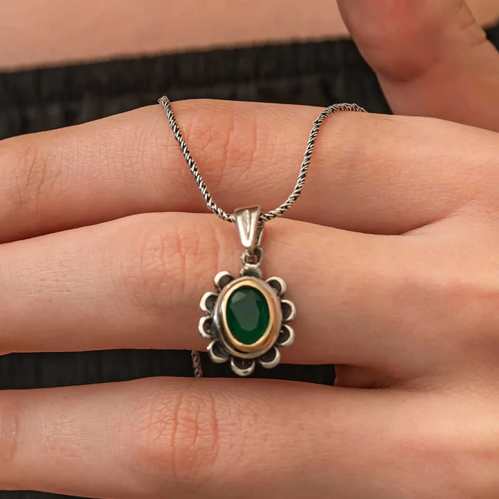 Yeşil taşlı çiçek desenli otantik küpe geleneksel ve modern tarzları bir araya getirerek stilinize ikonik bir dokunuş katıyor.Hem bohem hem de klasik stillerle mükemmel bir uyum sağlar.Doğum günü hediyesi, sevgililer günü hediyesi veya annelere hediye olarak özel günlerde tercih edilebilecek mükemmel bir seçenektir.Gümüş yeşil otantik set 925 ayar gümüşten imal edilmiştir. Gümüş üzerine rodyum kaplama yapılmıştır. Rodyum kaplama yapılan gümüş otantik kadın set parlaklığını uzun süre muhafaza eder ve oksitlenmesi gecikir. Tüm kadın setlerde olduğu gibi gümüş otantik kadın set de el emeği ile üretilmiştir. Gümüş ve değerli taşlar nedeniyle belirtilen ortalama ürün ağırlığında ± %10 sapma olabilmektedir.