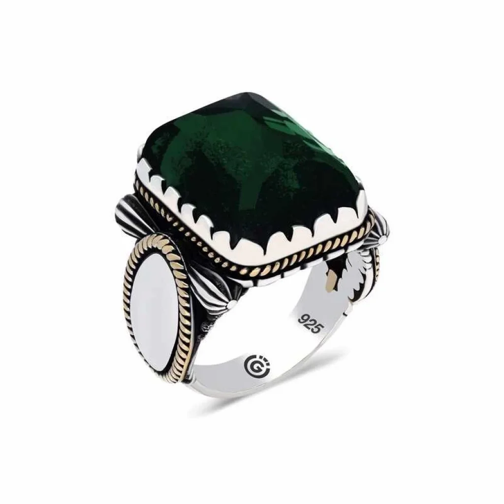 ​Gümüş Yeşil Zirkon Taşlı Kare Erkek Yüzük