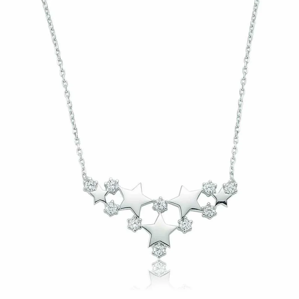 Işıltılarına gözümüz dalarken düşüncelere büründüğümüz yıldızlar gökyüzünün hakimleridir, sizler de kalbinizin hakimine ve sevdiklerinize bu anlamlı kolyeyi hediye edebilirsiniz. Yıldızlı bayan kolye 925 ayar gümüşten imal edilmiştir. Gümüş üzerine rodyum kaplama yapılmıştır. Rodyum kaplama yapılan gümüş bayan kolye modelleri parlaklığını uzun süre muhafaza eder ve oksitlenmesi gecikir. Kolye üzerinde bulunan taşlar zirkondur. Gümüş olab zincir boyu ortalama 45 cm"dir. Tüm gümüş bayan kolye modellerinde olduğu gibi gümüş yıldızlı bayan kolye de el emeği ile üretilmiştir. Gümüş ve değerli taşlar nedeniyle belirtilen ürün ağırlığında ± %10 sapma olabilmektedir.