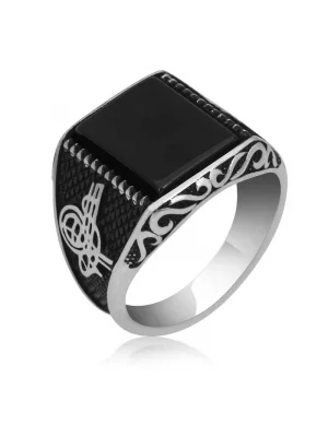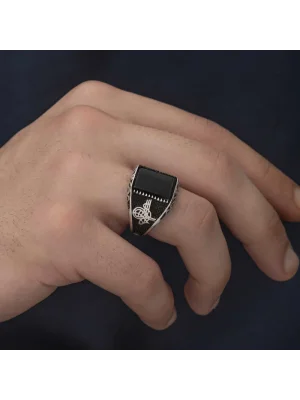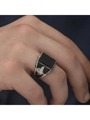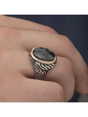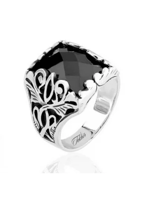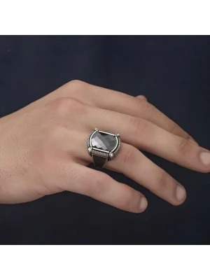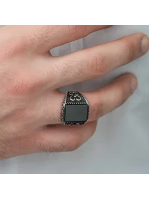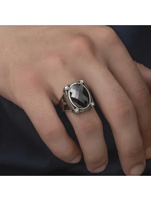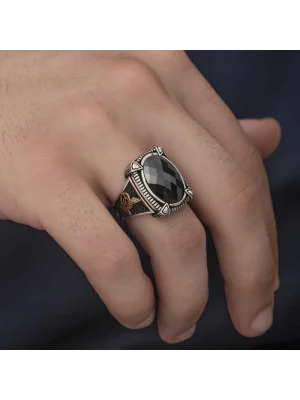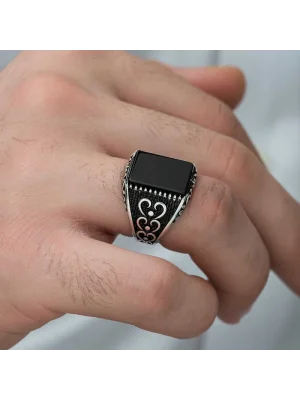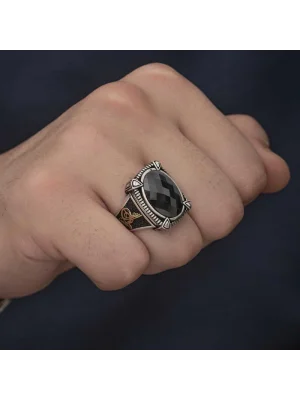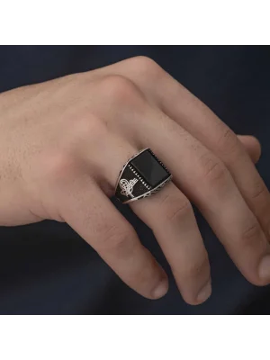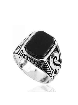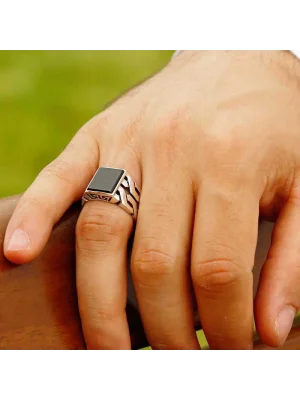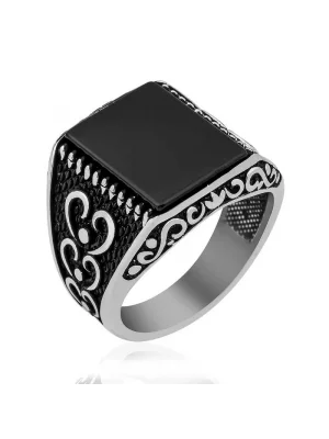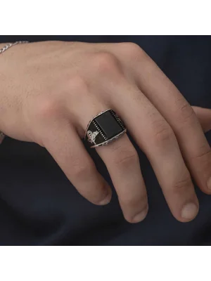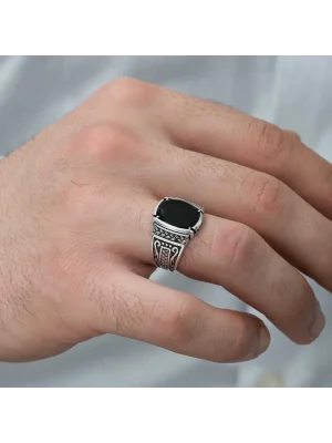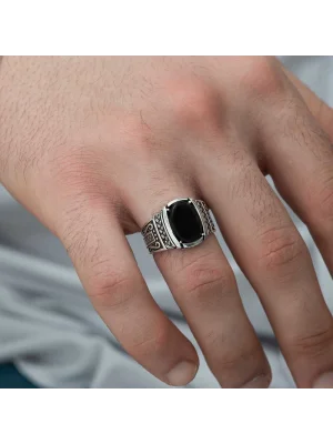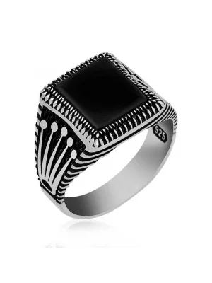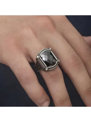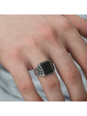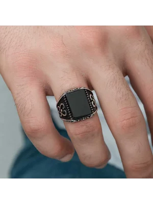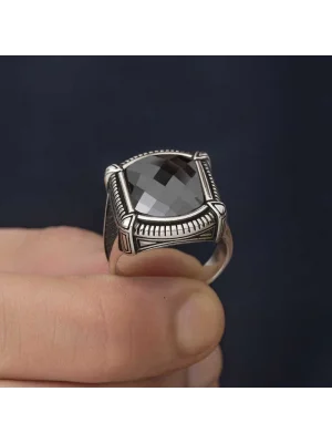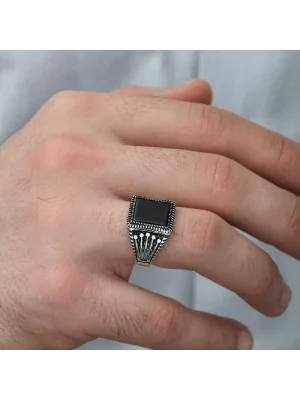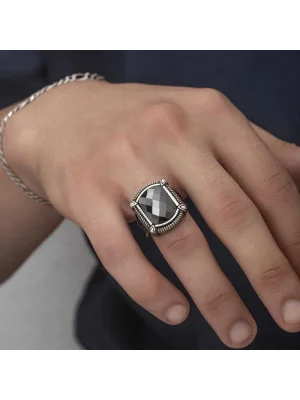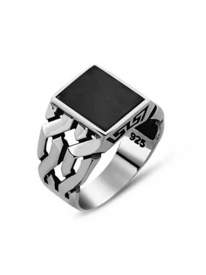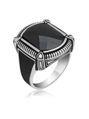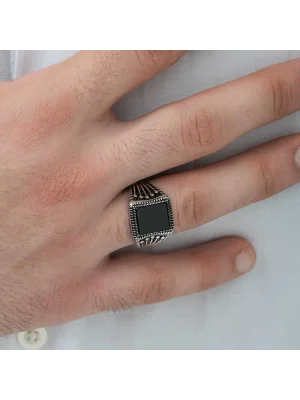 Gümüş Zirkon Siyah Taşlı Kare Erkek Yüzük