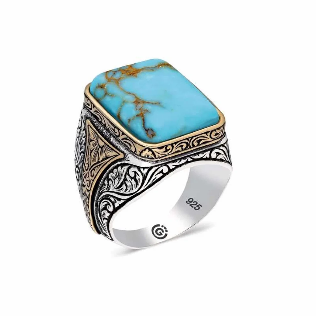 Gümüş Zirkon Turkuaz Taşlı Kare Erkek Yüzük