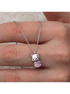 Gümüş Pembe Taşlı Sevimli Kedi Kadın Kolye