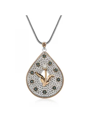 Gümüş Yeşil Çiçek Desenli Otantik Kadın Kolye