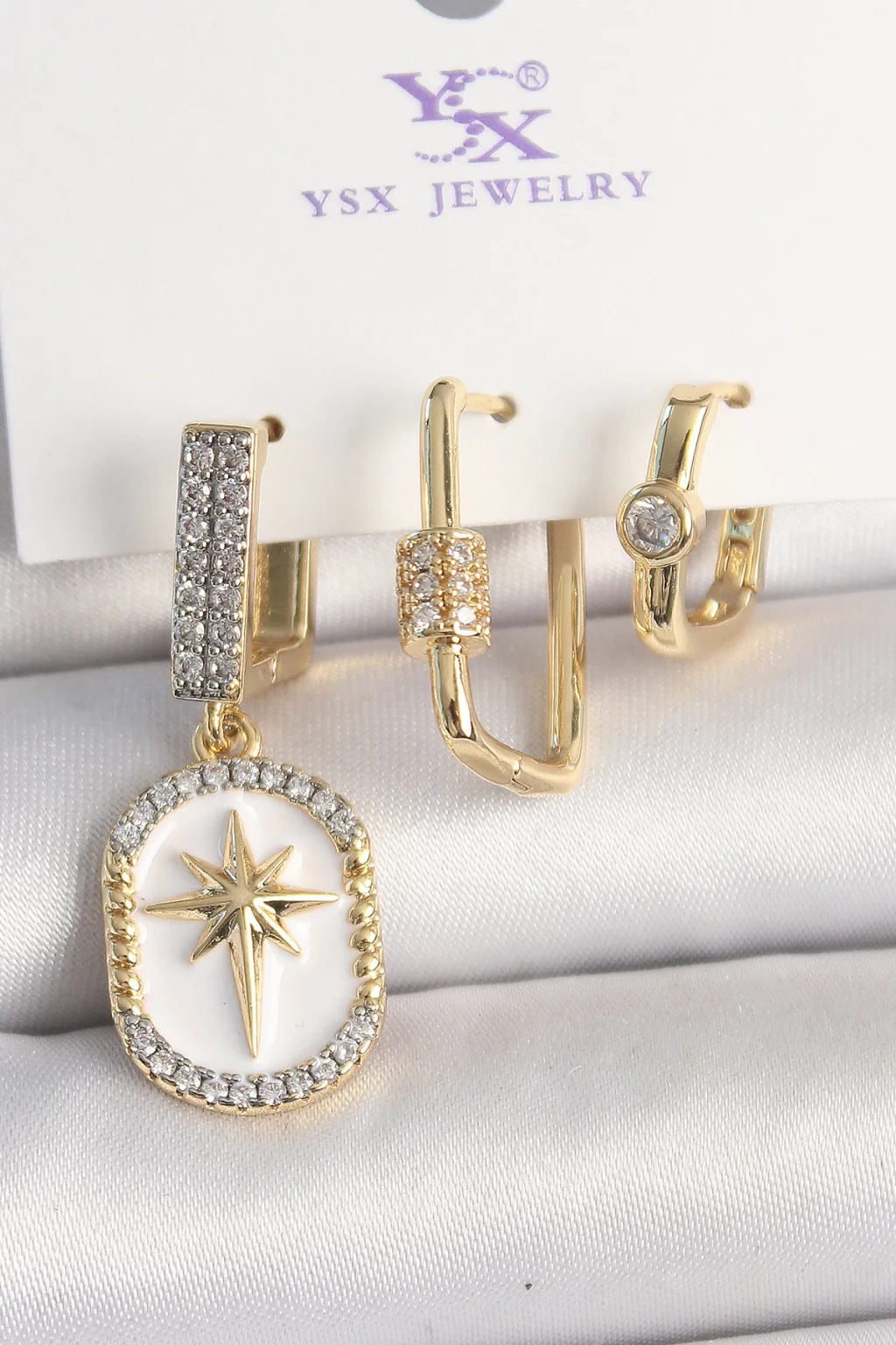 Pirinç Gold Renk Sallantı Zirkon Taş İşlmeli Yıldız Portre Model 3'Lü Kadın Kombin Küpe