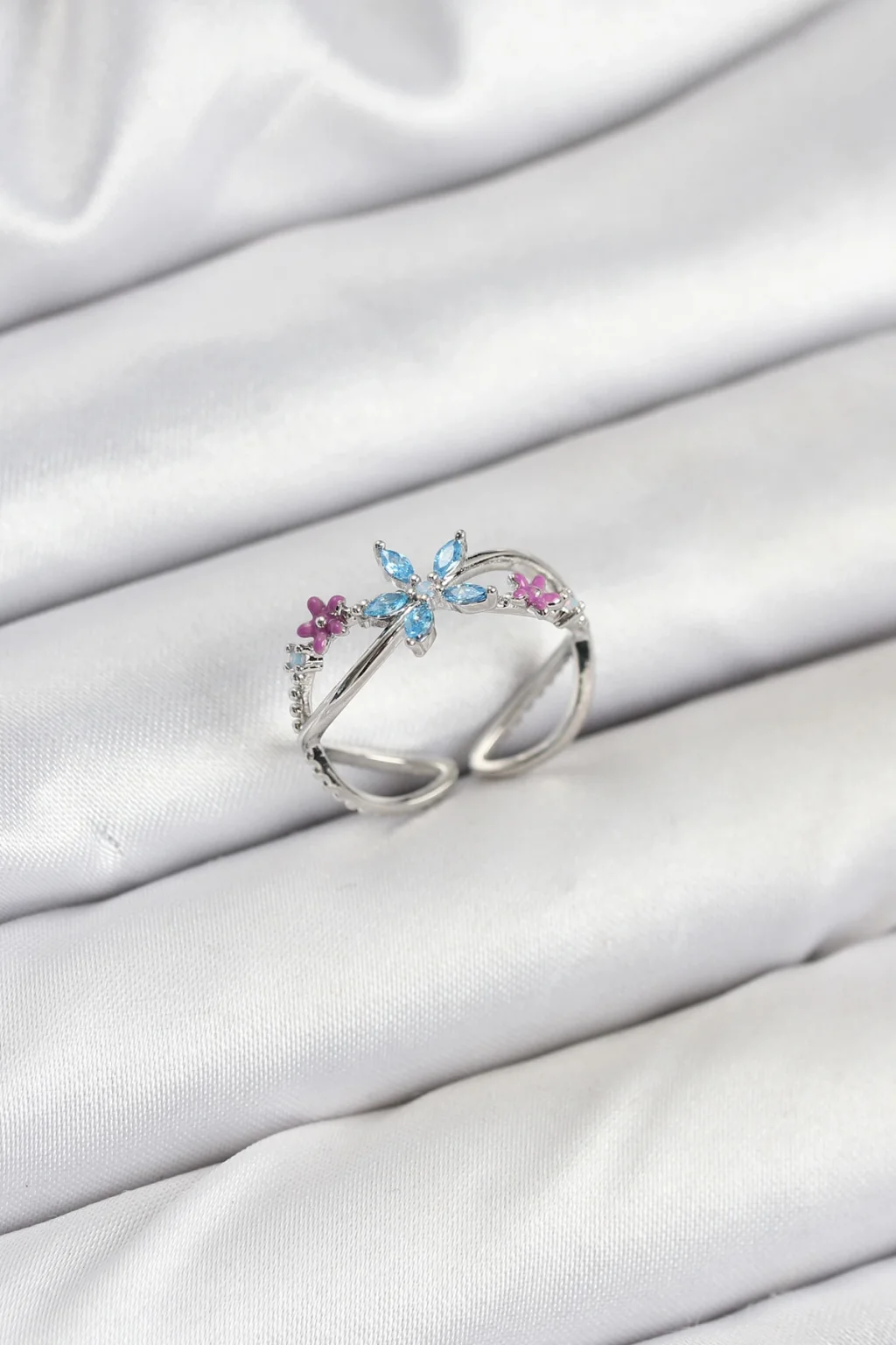 Pirinç Gümüş Renk Zirkon Taşlı Mavi Çiçekli Kadın Yüzük