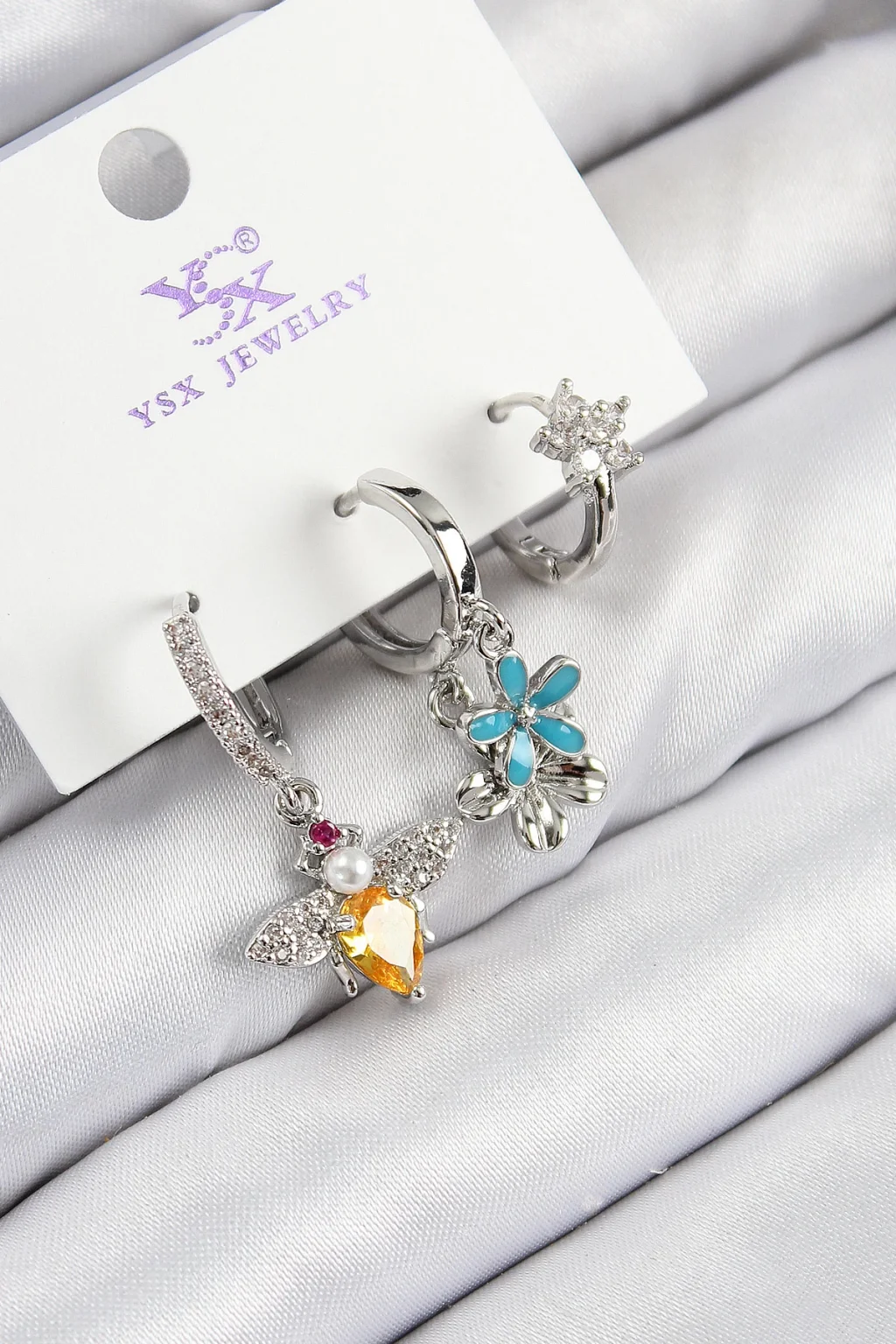 Pirinç Zirkon Taşlı 3'lü Arı Ve Çiçek Model Gümüş Renk Kadın Küpe