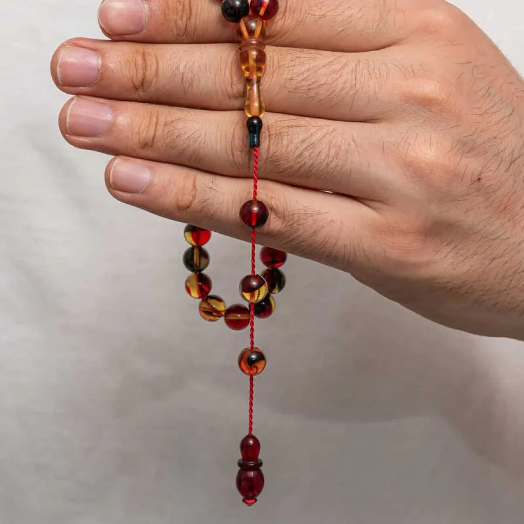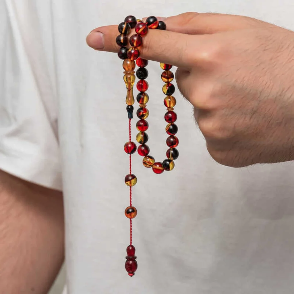Kehribar, çam ağacı reçinesinin toprak altında uzun yıllar boyunca birikerek oluşan bir maddedir. Hemen hemen taş ile aynı sertliktedir fakat yoğunluğu düşüktür. Çam kokusu yayar. Oluşumu uzun zaman aldığından ve yapay olarak yapılamadığından değerli bir maddedir. Sıkma kehribar ise kehribar taşından farklı olarak onun özelliklerini taşıyan, görüntü itibariyle ona benzeyen fakat gerçek olmayan bir malzemedir. Ülkemizde ve dünyanın bir çok yerinde kehribar taşından çeşitli malzemeler üretilmiştir. Ülkemizde en yaygın olarak tesbih üretilmektedir. Kehribar tesbihler elde ısındıkça kehribar benzeri bir koku verir ve renk değiştirir. Bir çok rengi vardır. Hatta iki rengin birleşiminden oluşan kehribar tesbih modelleri de vardır.Ülkemizin güzide tesbih ustaları bu malzemeyi sıklıkla işlemek suretiyle çeşitli sanat eserleri meydana getirirler. Bu tesbihler de koleksiyonerler tarafından alınıp satılmaktadır. Sıkma kehribar tesbih modeli de günlük hayatta kullanılabilecek çok şık bir tesbih çeşididir. Özel günlerin vazgeçilmez hediyesi sıkma kehribar tesbihler erkekler için doğum günü, sevgililer günü ve babalar günü gibi özel zamanlarda hediye olarak tercih edilebilir.Sıkma kehribar tesbih modeli diğer kehribar tesbih modellerinde olduğu gibi tamamen el emeği ile imal edilmiştir.