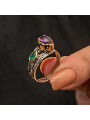 Gümüş Ametist Taşlı Zümrüt Otantik Ayarlanabilir Kadın Yüzük