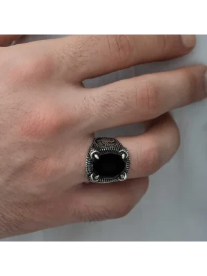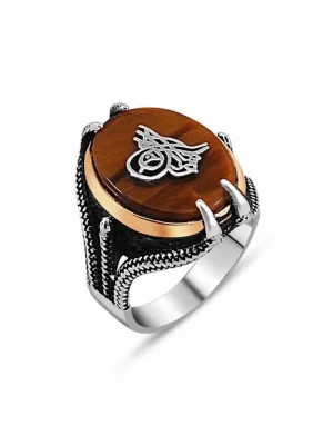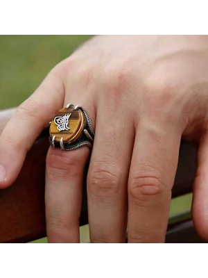 Gümüş Kaplan Gözü Taşlı Tuğralı Erkek Yüzük