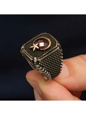 Gümüş Kırmızı Taşlı Ay Yıldız Erkek Yüzük